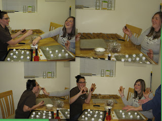 Aunt Wendy and Aunt Stacy began rolling the cookies and got a bit "cookie rolling drunk".